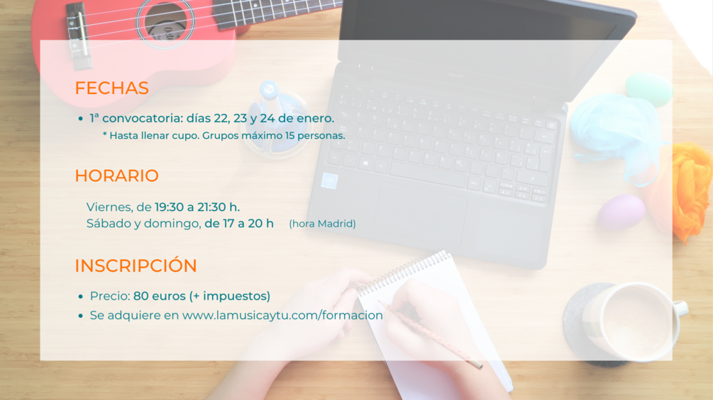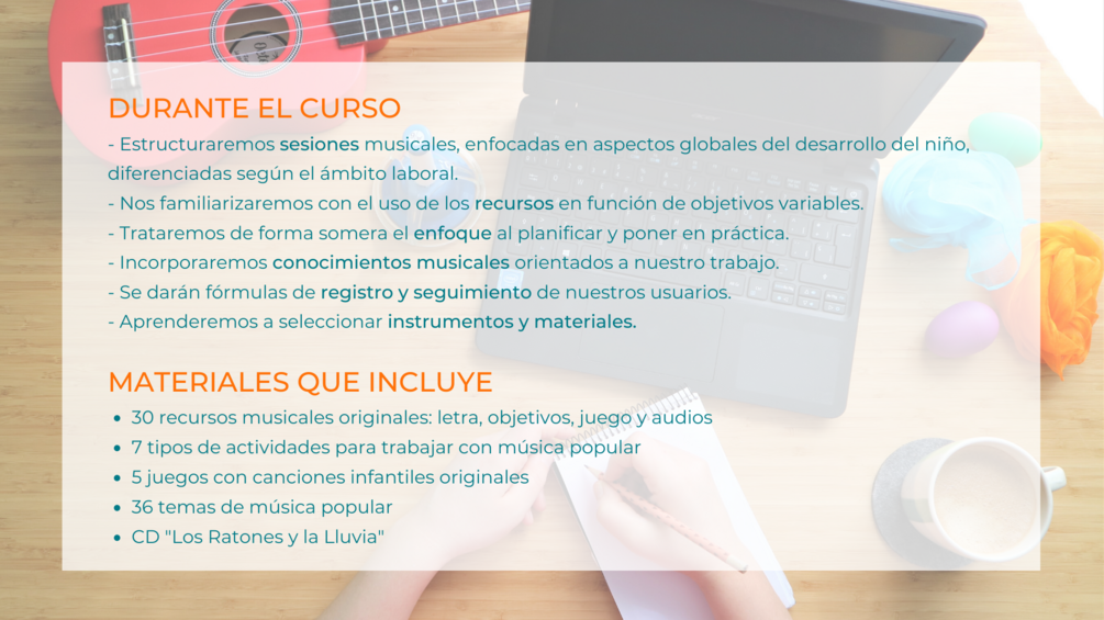 Se trata de una formación online muy práctica que tiene el objetivo de dotar a los asistentes de un repertorio de recursos originales y variados, pensado para el trabajo con niños de 0 a 5 años a través de la música.